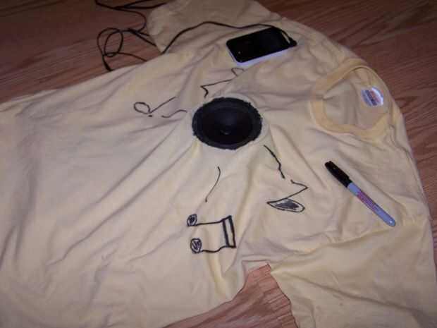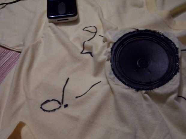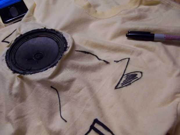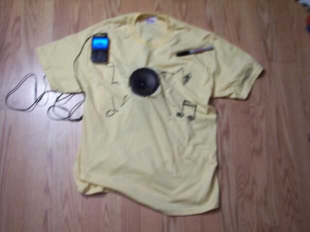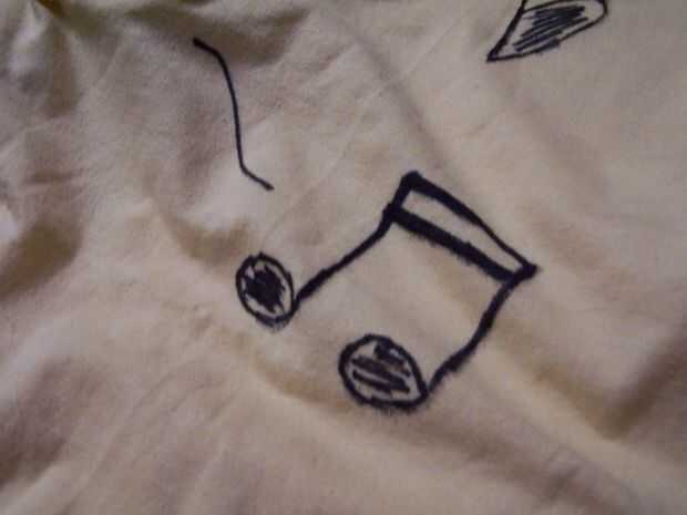Está bien, así que cogí un rotulador en mi prisa por rápidamente esbozar algunas notas musicales y hey! no es tan malo! Añadirlo que quieras, puedes agarrar alguna pintura de tela, diseños de stencil en la camiseta, lo que sea! Para ser realmente lujo, silk-screen de un diseño sobre la camiseta antes de empezar y dejar un espacio para el altavoz ser montado. Esperar un producto más agradable aspecto en mi primera revisión, debido a este verano.