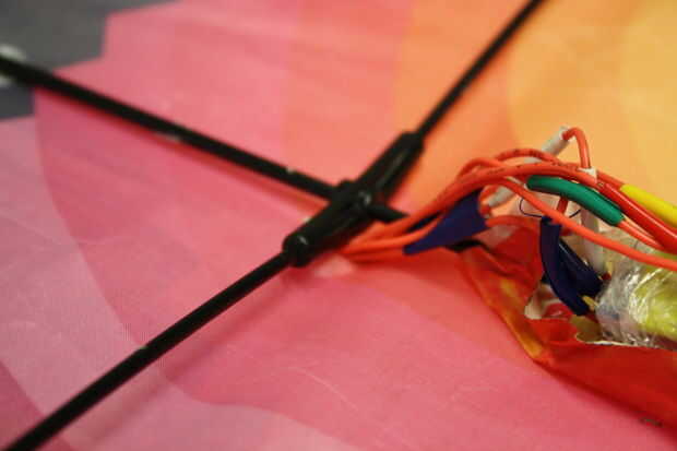 4. Fije la placa PC con acelerómetro para la cometa. Hemos asegurado a la pieza larga, vertical, justo debajo de la Cruz.