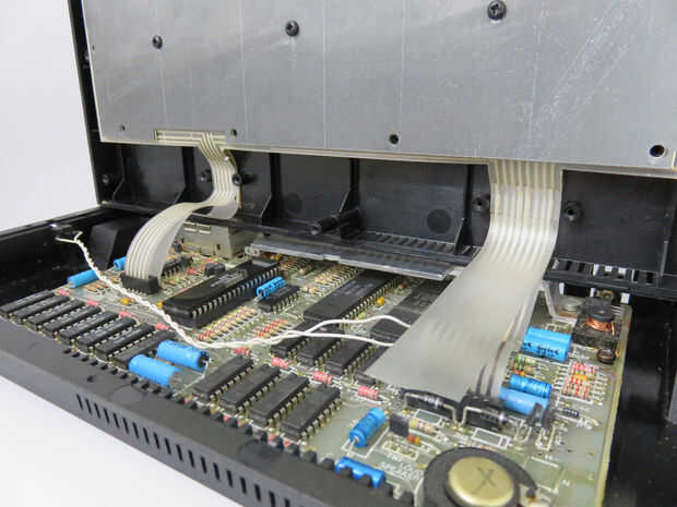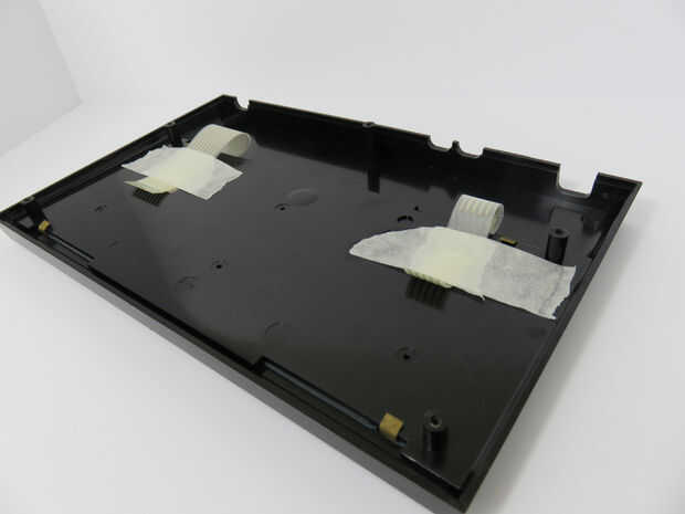 Quite los tornillos de la parte inferior del Speccy. Manteniendo las dos mitades juntas, girar el Speccy vertical en la orientación que debería escribir con. Levante lentamente la tapa del Spectrum, manteniendo la parte superior (borde de puerto) hacia abajo y ligeramente hacia usted. Así las membrana las cintas son agradable y suelto (ver la 1ª foto arriba). Tirar de las cintas firmemente hacia arriba usando ambas manos para cada uno. La parte superior la mitad debe ahora salir. Te recomiendo que uses cinta adhesiva para sujetar suavemente las cintas a la tapa (2ª foto arriba).
