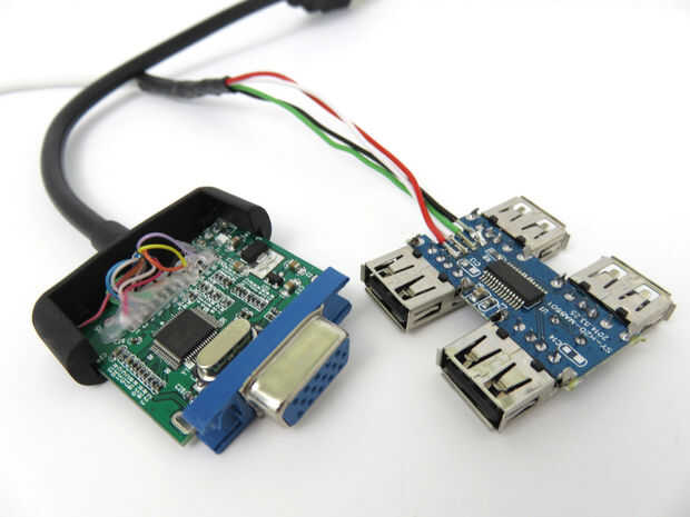 Vas a tener que tira las envolturas de plástico la cabeza VGA y su hub USB, a git ellos tan pequeños como sea posible. Para abrir el adaptador VGA, coloque su destornillador plano de cuchillo en el borde alrededor del puerto VGA y licenciado de la carcasa exterior hacia atrás. La placa frontal debe pop off y la cubierta externa puede Deslice hacia abajo el alambre. Ahora quite el plástico envolvente dejando solo el PCB y el puerto, y luego finalmente aflojar los tornillos a ambos lados para dejar solo el conector VGA en el extremo.