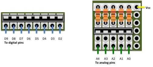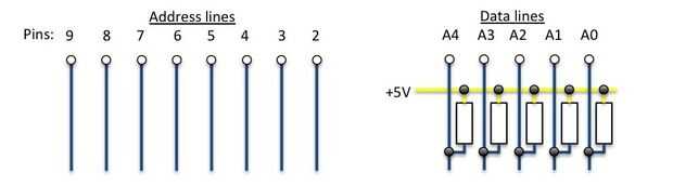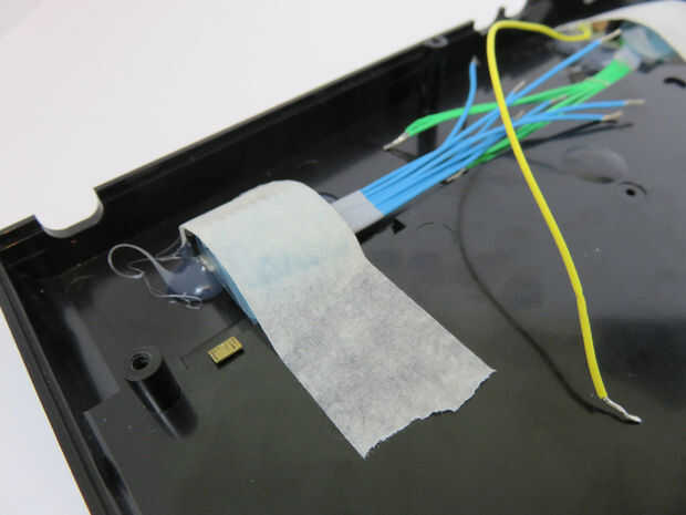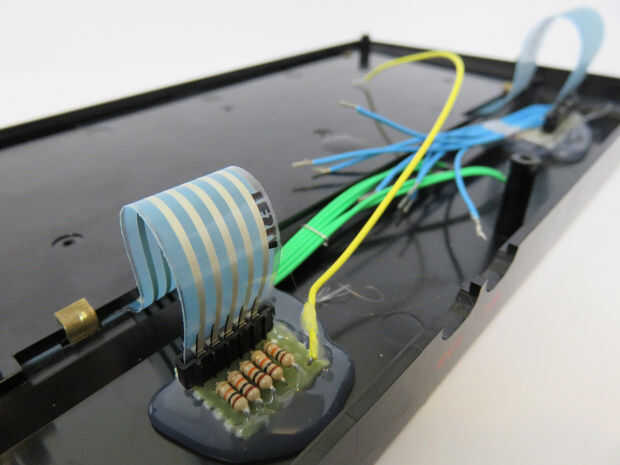 Permite obtener tu curso de teclado! Usted necesitará hacer una tabla por conector. El conector de 8 pines (líneas de dirección) simplemente los cables conector de la cinta a los pines digitales del Arduino. El conector 5 pines cables de la cinta de datos para entradas analógicas del Arduino a través de resistencias de pull-up de 10K ohm. Puedes ver los dos circuitos por encima (imagen 3). La imagen 4 muestra cómo puede implementar los circuitos en los tableros de perf. Tenga en cuenta las orientaciones de los conectores de cinta; el conector de datos (5 pines) tiene contactos en la parte inferior y el pin 8 tiene contactos en la parte superior. Personalmente, he añadido cabeceras de las tablas en lugar de soldar los cables directamente en modo que sean fáciles de desconectar o cambiar si cometo un error. Asegúrese de que sitúa todo hacia fuera antes de decidir sobre su longitudes de alambre; los conectores de cinta tienen que alinearse a donde las cintas salen de la tapa. Cuando estés feliz, conectar todo y pegamento caliente las juntas en su tapa. Conecte suavemente tus cintas y cinta adhesiva hacia abajo para protegerlos. Usted puede verlo arriba en las imágenes 5 y 6. Por último, posición tu Arduino donde habrá sala cuando consigue cerrarla para arriba. Pegamento a la tapa demasiado y enchufe los cables.