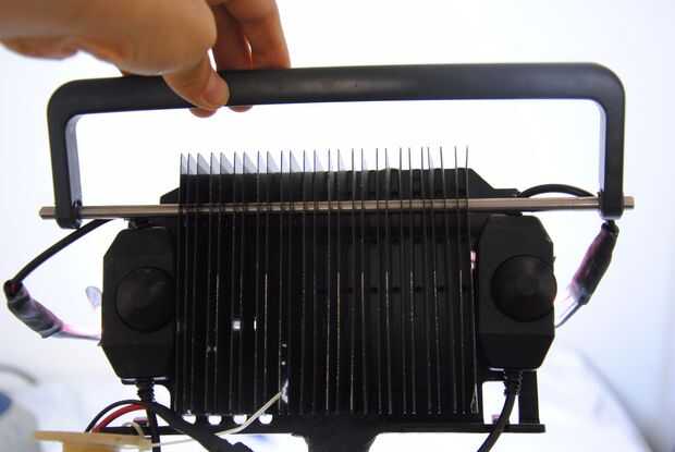También encontré un tamaño perfectamente metal rod ** (rescatado de una impresora) en mi caja de "Varillas de Metal de desecho". De longitud era sólo un poco más largo que el mango y el diámetro era un poco más pequeño que el diámetro del orificio del disipador de calor, perfecto!