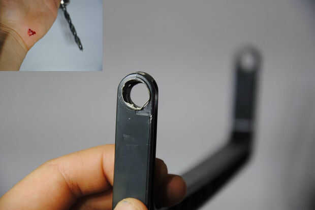 perforé dos agujeros con mi taladro en la empuñadura, recomiendo hacerlo con una broca de 6-8 mm. Usted probablemente puede ver en la imagen que perforé mi mano. Eso no fue divertido, aprenda de mis errores y uso guantes.
