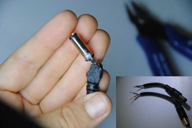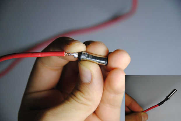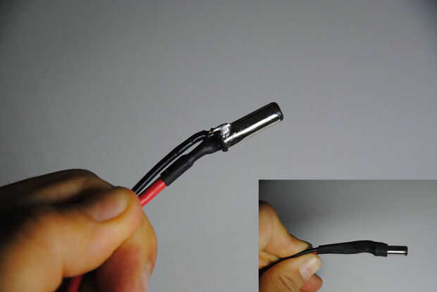 Después de quedarse con sólo el conector de metal, la soldadura de un grueso cable rojo a la conexión media (+) del conector, no te olvides de aislar con la tubería del encogimiento (Foto #3)