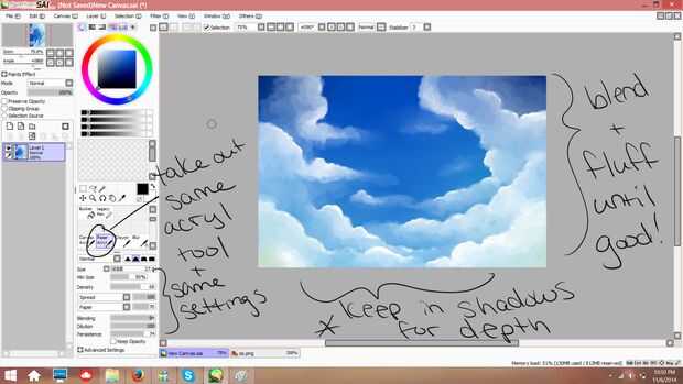 Volver a la herramienta de acrílico (no te preocupes, la configuración de este cuadro debe ser todavía guardar por SAI) y mezcla de los elementos más destacados. Seguir mezclando con esta herramienta hasta que haya alcanzado la cantidad deseada de esponjosidad y de color.