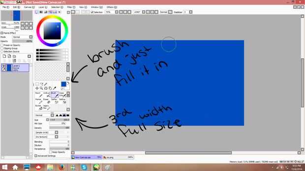 Comience con una base azul en lo que sea tamaño de lienzo (yo aquí usé un tamaño de 8 x 12 pulgadas). Vamos a mezclar más tan que ser medio azul que aparece en días claros. Es más fácil oscurecer o aclarar más tarde con la mezcla. Utiliza la herramienta pincel a color completamente tu lienzo en tamaño máximo.