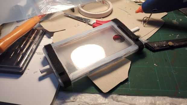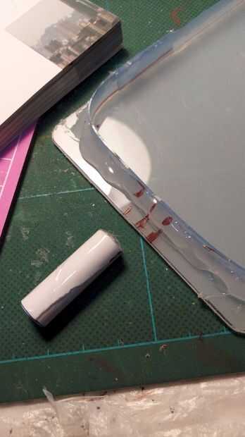 - Rodillo de cilindros de papel y pegamento en los lados cortos, en una línea imaginaria nivelado con la cámara fotográfica. Actúan como alfileres que giran la caja.