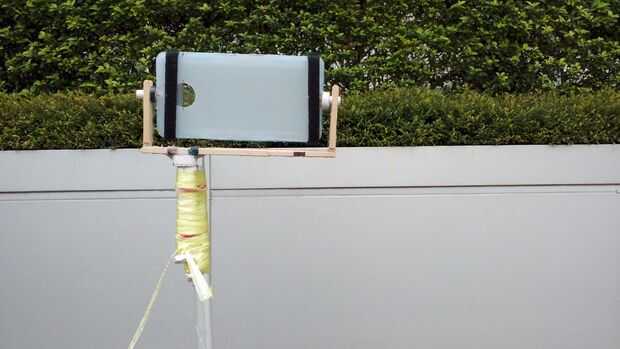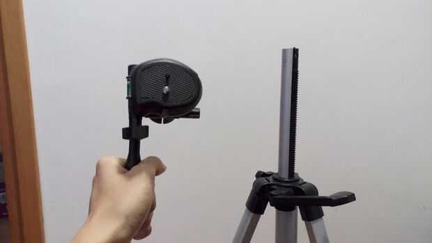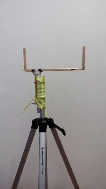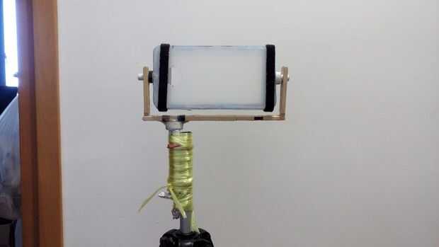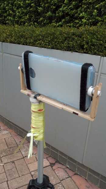 Utilicé un trípode viejo barato. Quitar el soporte de la cámara, quisiera goma todo. Entonces usé alguna cuerda para asegurar el aparejo después de nivelar.