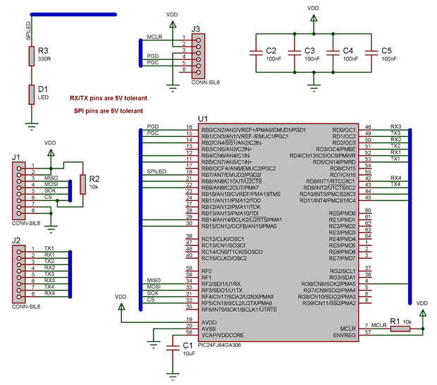 U1 es el microcontrolador PIC24FJ64GA306, elegí este chip ya que tiene cuatro periféricos UART y era más barato que pude encontrar por compras en Farnell y microchipdirect. El chip también ofrece varios 5V tolerantes pins de I/O lo que significa que a pesar de que el dispositivo tendrá que ser alimentado a 3, 3V que funciona igual que con los sistemas de 5V.