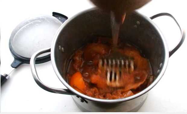 Permita que la sidra se enfríe un poco para facilitar su manejo. Luego coloque un colador fino sobre un tazón o una jarra. Dar a la sidra un puré rápido con un machacador o una cuchara grande y retire la canela y trozos de fruta.