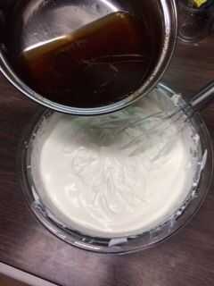 Después de la crema se refuerza, doble gradualmente el almíbar enfriado en la crema.