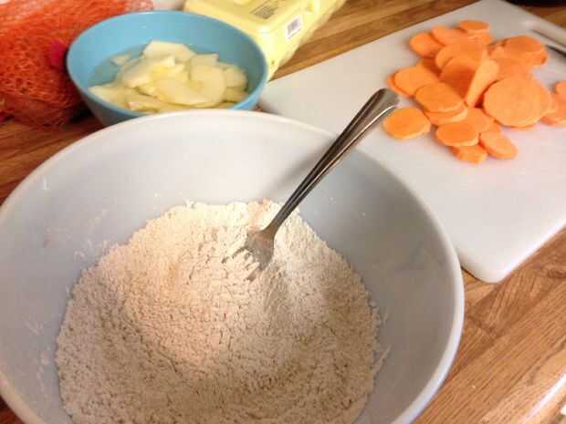 Mezcle harina, he usado una copa, con un poco de canela molida y jengibre. He añadido las especias hasta que esta mezcla olía a tarta de manzana. Coloca algo de hielo en un recipiente con algunas sidra de manzana y dejar a un lado. No los mezcle hasta que esté listo para freír