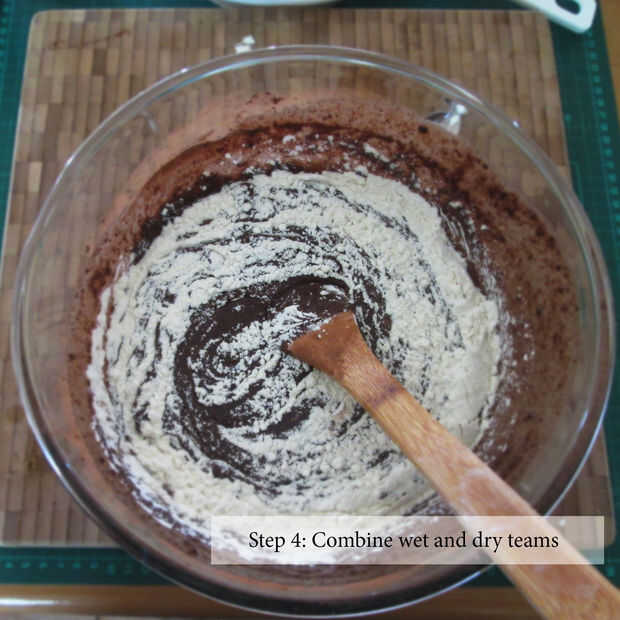 Combinar los ingredientes húmedos a los ingredientes secos. Mezclar juntos para crear una masa espesa. La masa es bastante rígida, pero esto significa un brownie más denso. Un brownie más denso es un brownie más feliz.