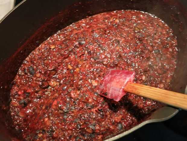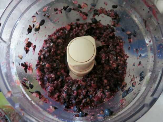 Aplaste los arándanos, encontrar la manera más rápida es pulsar unas cuantas veces en mi procesador de alimentos, no pulverizarles, solo machacar, también se puede utilizar una trituradora de la patata. (Usted debe tener 4-1/2 tazas de arándanos).