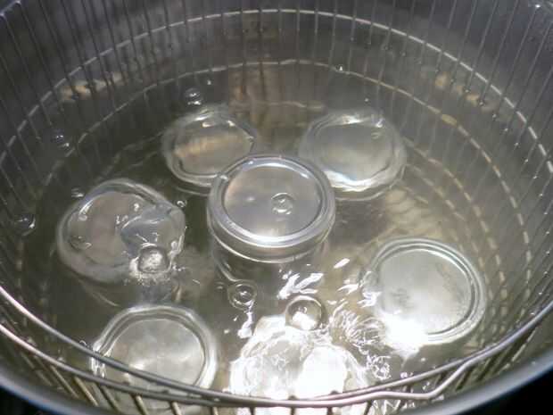 Hojear rápidamente de espuma con una cuchara de metal. Cucharón a la vez en tarros de cristal caliente, esterilizada, (yo también uso oz.jars 4), dejando espacio libre de 1/4 de pulgada. Limpie los bordes con toalla de papel húmeda, ajustar las tapas y poner el tornillo bandas punta de los dedos apretados. Proceso en una olla de agua hirviendo durante 5 minutos (temporizador de arranque cuando el agua vuelve a hervir). Apague la hornilla y deje frascos en el agua durante 5 minutos. Quitar a racks de refrigeración o toalla de cocina en su contador. Deje frascos en por lo menos 12 horas antes del etiquetado y almacenamiento.