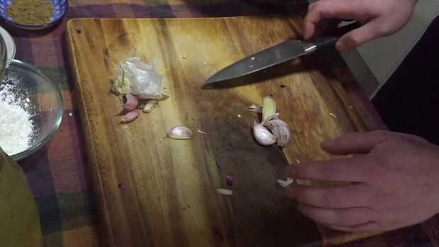 Tomar alrededor de 4 dientes de ajo, otra vez si te gusta más no dude en agregar más. Con la parte plana del cuchillo, machacar el ajo pero lo dejas todo, lanzar esta en el recipiente con el resto de los ingredientes.