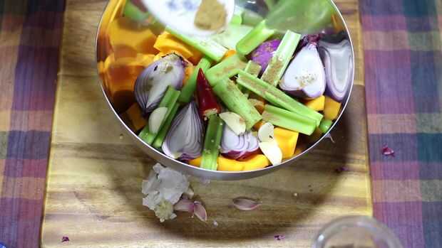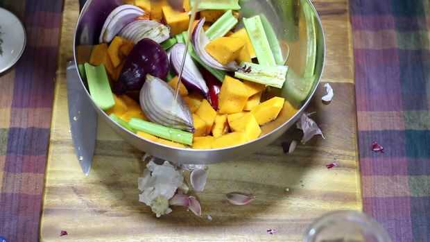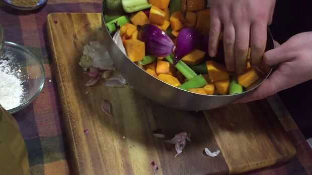 Con la mano, mezcle todas las verduras y sazonar en el aceite, se puede utilizar una cuchara pero más divertido para conseguir sus manos en allí.