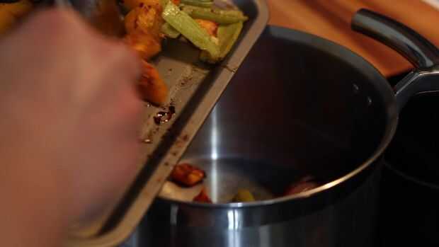 Una vez asado, transfiera a una cacerola a fuego medio y añadir 1 litro de caldo o hasta cubrir, llevar esto hasta el punto de hervor.