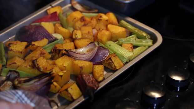 Poner la verdura en una bandeja para hornear y asar en el horno a 200 grados centígrados durante 30-40 minutos hasta que estén doradas.