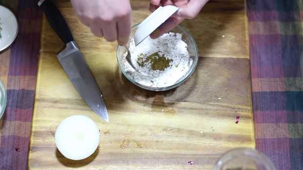 5. Tomar la cebolla del agua y a su vez la harina / comino mezclar y colocar en una placa