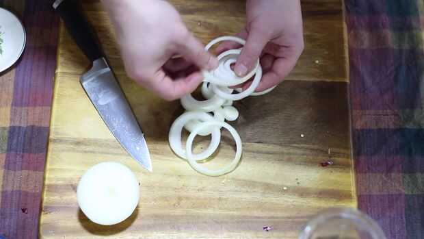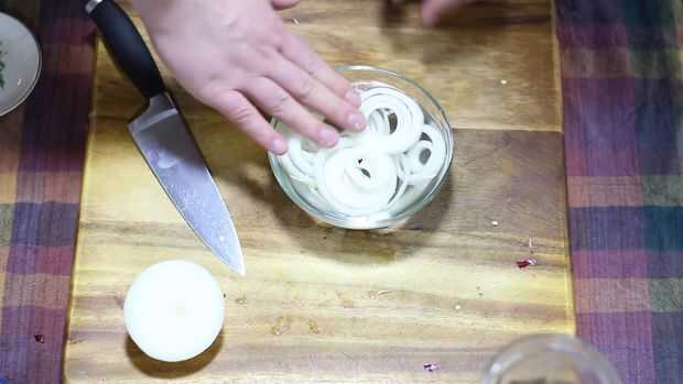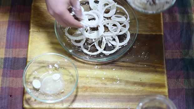 3. Separar los anillos de la cebolla y colocar en agua fría en remojo durante 5 minutos