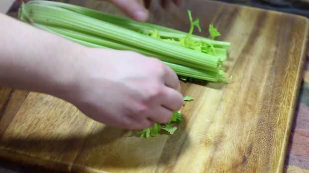 Mayoría de la gente deseche las hojas de apio pero son realmente sabrosos y hacer una gran guarnición así que por qué no usarlos. Escoja algunas de las hojas del racimo de apio y poner a un lado.