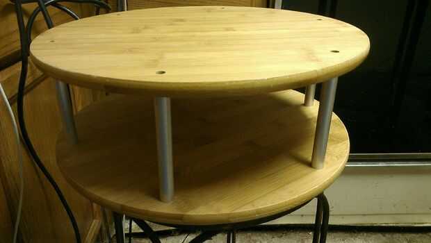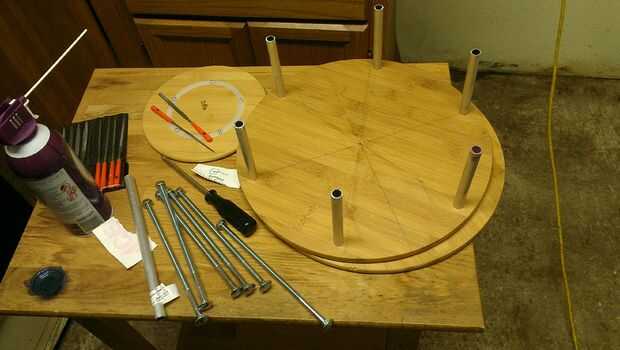 Primero muelen un agujero de 3/8 de pulgada hacia abajo con el punto central de cada soporte para el tornillo. Entonces muelen un agujero concéntrico 0,5 pulgadas 1/4 de pulgada en el bambú, teniendo en cuenta que medio fue superior y que fue inferior que el lado de 0,5 pulgadas enfrentaría al otro cuando se apilan.