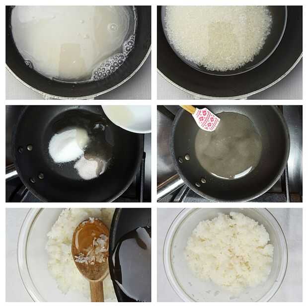 En una olla pequeña, agregar el vinagre de arroz, azúcar y sal. Calor medio hasta que se disuelvan los gránulos, unos 2 minutos. Luego dejar reposar. Cuando el arroz esté hecho, retirar el kombu y desechar. Luego transferir el arroz a un tazón grande de poca profundidad. Sostenga una cuchara de madera plana, amplia sobre el arroz y vierta la mezcla de vinagre sobre la cuchara, dejándola suavemente caen sobre el arroz. Entonces ligeramente mezcle el arroz alrededor de la taza, dejando que la mezcla de vinagre cubra el arroz. Luego con la cuchara, scoot el arroz a un lado del tazón de fuente. Poco a poco, especie de "corte" el arroz con la cuchara y ventilador en el tazón de fuente. Continúe hasta que cada grano de arroz es agradable y separado en el recipiente. Cubrir con un paño húmedo y reservar.