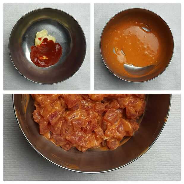 En un tazón pequeño, batir el mayo y sriracha salsa juntos hasta combinar. Luego mezcle el atún en dados, mezclar bien y reservar.