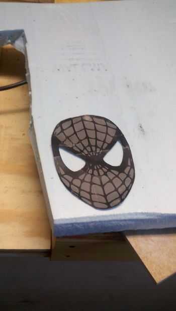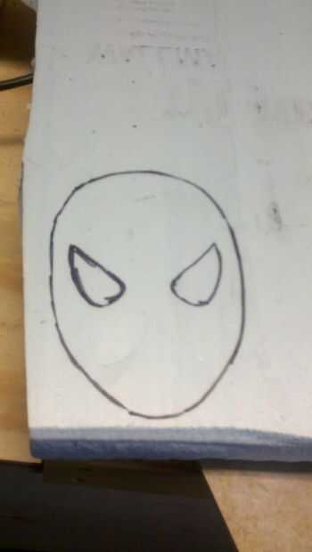 Comencé imprimiendo y recortando una imagen de la máscara de Spider-man y trazar el contorno de la máscara y los ojos, luego cortar la máscara total. Idealmente yo sería capaz de este corte con un cortador de espuma caliente, pero no han creado uno todavía, así que tuve que hacer con un cuchillo muy afilado.
