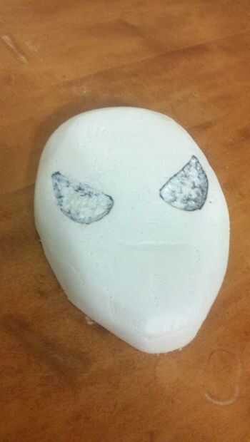 Una vez que la forma general fue recortar solía 220 lija un bisel alrededor de la totalidad de la máscara para que se vea menos bloques de arena. Luego utilicé un soldador a fuego medio para derretir a los ojos. Puede ser una mejor herramienta para esto, pero el calor bajo el soldador me ha permitido crear una depresión para los ojos sin quemarse a través de la espuma... Creo que resultó bastante bien hacia fuera.
