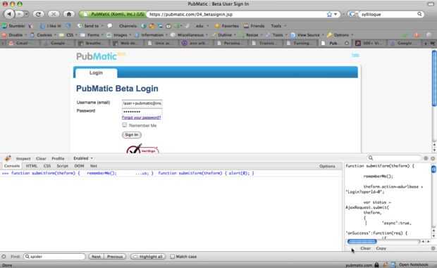 Vamos a empezar por obtener la información de encabezado enviada desde el navegador al hacer clic en enviar. Si esto fuera un inicio de sesión de navegador ordinario utilizar Mechanize rellene el formulario y haga clic en enviar. Formas de inicio de sesión normal se encapsulan en < forma >... < / forman > etiqueta y Mechanize serían capaces de presentar esto y encuesta de la página siguiente sin problemas. Puesto que no tenemos una etiqueta de formulario, la función de envío está siendo manejada por javascript. Vamos a ver la función submitForm de pubmatic. Para ello, primero abra la página web en firefox y encienda firebug pulsando la luciérnaga en la esquina inferior derecha. Haga clic en la ficha secuencia de comandos, copiar todo el código que aparece y pegarlo en tu poco de software de edición de texto favorito. Luego puede eliminar todo el código excepto la función submitForm. Se inicia con la función "submitForm(theform) {«y entre esto y las funciones de cierre soporte rizado"} ".