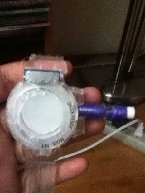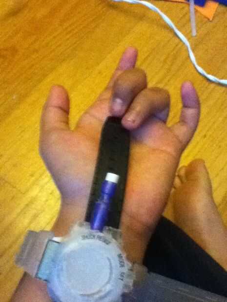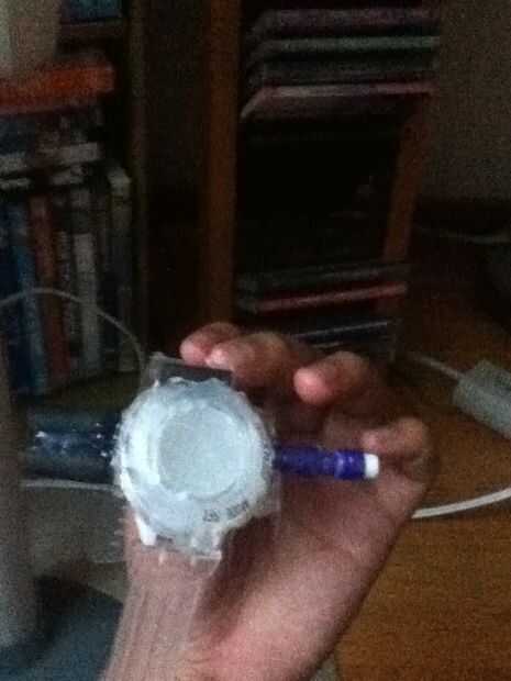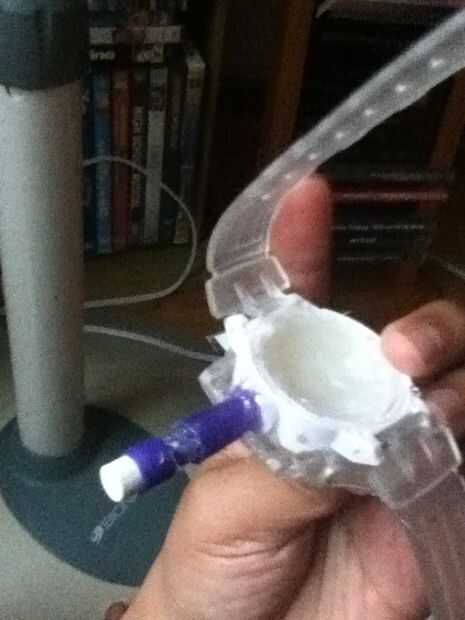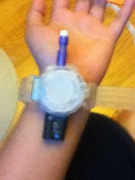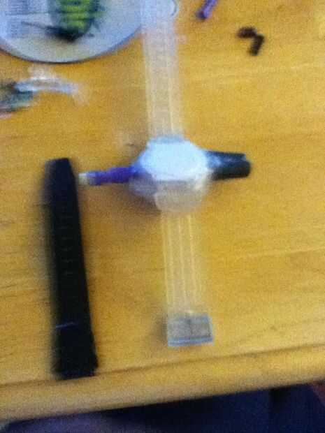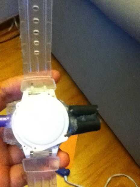 Tomar el otro reloj gomoso y cortar una de las correas laterales y pegamento a la parte inferior del "reloj". Con el pegamento caliente pistola hacer pegar golpes. Que va a ser somos tus dos dedos ir.