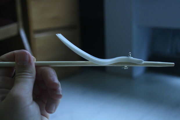 Ahora que la cuchara y palillos tienen agujeros, puede ser Unidos con el cable de la pendiente. Antes de insertar el alambre de la pendiente a través de ambos orificios enderezarlo hacia fuera. Luego pegarla a través de los agujeros. Decidí que al final de cuentas en la parte superior. Sin embargo, no importa la orientación. Restringir el otro extremo con un pendiente hacia atrás y cortar el cable sobrante con unas tijeras. (La imagen adjunta es un fork, pero siguió los mismos pasos)
