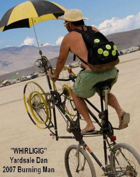 Mi inspiración fue Yardsale Dan, cuyo tallbike "Perinola" fue para el Festival del hombre ardiente en 2007 (Foto 2). Su complejo sistema de cadenas y engranajes fue abrumador, por lo menos, así que configuré un método más simple.