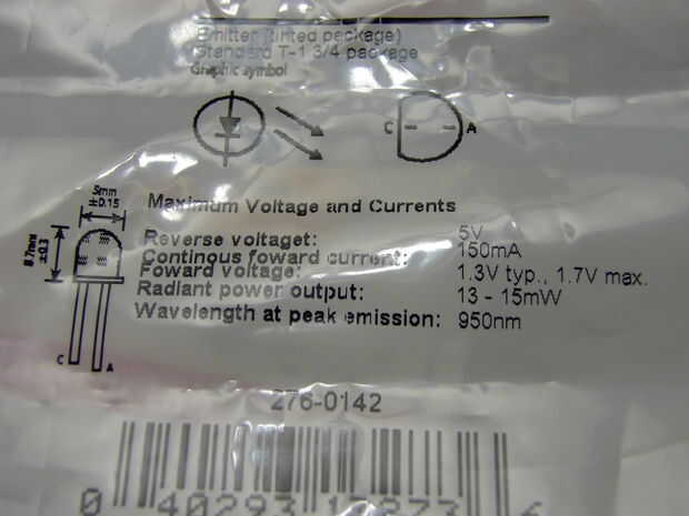 En un lado tangente (Tangent), shack de radio estúpido! en la parte posterior de la IR led / transistor de la foto indica la corriente continua máxima del led fue 150ma. ¡No es posible! En su página web afirma 40ma que es mucho más en la línea de otras partes con las mismas especificaciones, terminé llevando a 30ma justa causa llego a encontrar resistencias de 150 ohm en primer lugar en mi cubo de piezas.