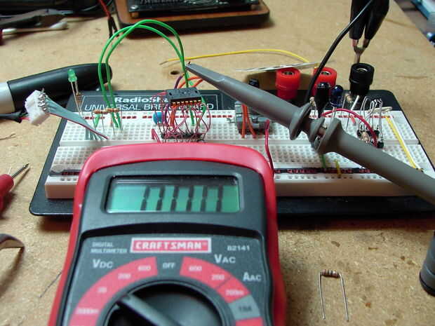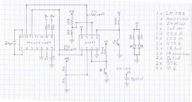 También el transistor de la foto está actuando más como un amplificador que un interruptor. Con salida bastante errático que demuestra para arriba en un ámbito como una línea serpenteante en todo tipo de tensiones entre los 2 extremos (tanto así que nunca pude llegar a mi alcance para almacenar una imagen de él), versus la señal cuadrada necesitada el chip de ratón. En pocas palabras necesitamos algo para tomar la decisión de "sí se trata de o no se trata de" y el 393 es construido específicamente para la tarea