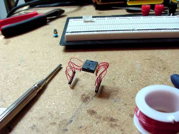 Primero el ratón chip no está en el mismo espacio de pin como la placa y el chip SOIC 8 está cerca de nada, para ocuparse de que usé wirewrap! El mayor de los 2 chips solo wirewraped a las patas del IC, y luego a un par de pines, el chip SOIC tuvo que soldar el cable wirewrap a sus conductores y luego los envuelven a otro conjunto de pines. Tardó un poco más tiempo pero problema resuelto.
