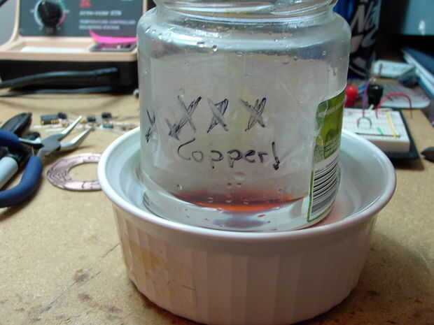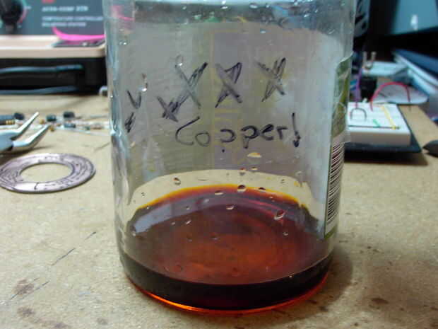 Una vez satisfecho (tanto como puede ser con un controlador izquierda dibujando un pcb con un marcador) su tiempo para grabar, he puesto suficiente encantar en un frasco de salmuera para cubrir la Junta. Yo también cocinados en el microondas un recipiente con agua para apenas bajo punto de ebullición (2:30 en mi horno de microondas) y luego ajuste el tarro de la salmuera en el agua durante unos 10 minutos, para calentar el encantamiento (nunca calor directamente). Retirar la jarra de agua y limpiar la parte inferior de su llegado el momento de colocar el pcb en el encantamiento, una vez en remolina alrededor casi constantemente, y todo el proceso no tomó ninguna hora en todos.