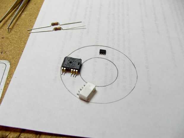 Una vez que llegué a casa me había trazado sobre una hoja de papel, mantiene el chip del ratón pulsado y hace poco puntos donde los extremos de los cables fueron y dibujaron líneas poco para las almohadillas, y luego hice lo mismo con el conector de cable, entonces el LM393. A continuación empecé a conectar con líneas en el papel de agregar cojines para componentes pasivos donde sea necesario basado en mi esquema.