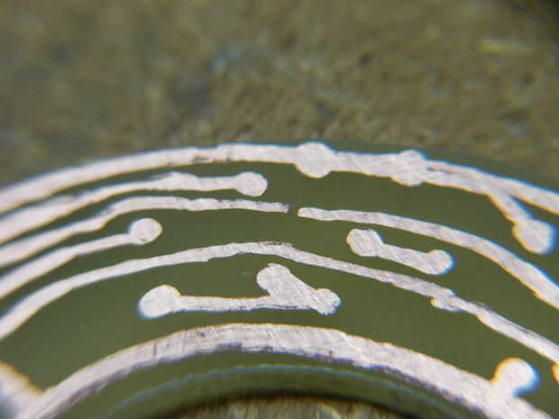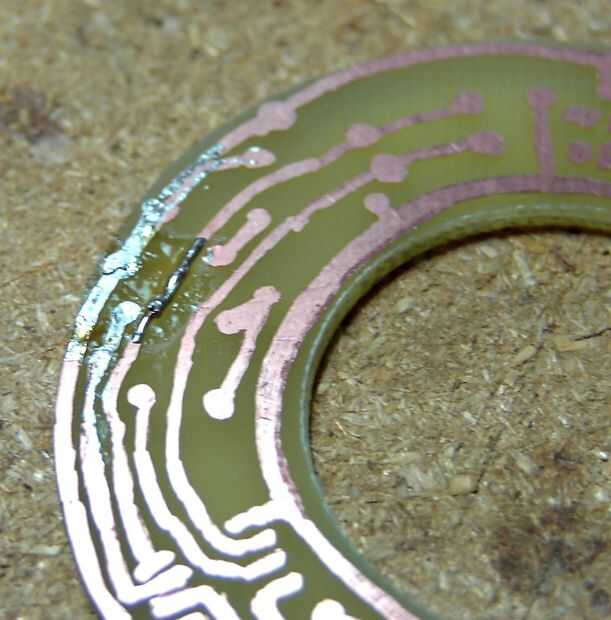 La junta fue quitada y lavada entonces inspeccionada (el encanto sobra es todavía en el tarro de la salmuera, que todavía tiene algunas más valor tableros pequeños de la energía en él). Marcador Sharpie no es los mundos mayor etch resist pero hace el truco, lamentablemente tuve 1 pausa pequeña en un rastro donde no era lo suficientemente grueso, y que tiene que ser fijo (en este caso con una gota de soldadura)