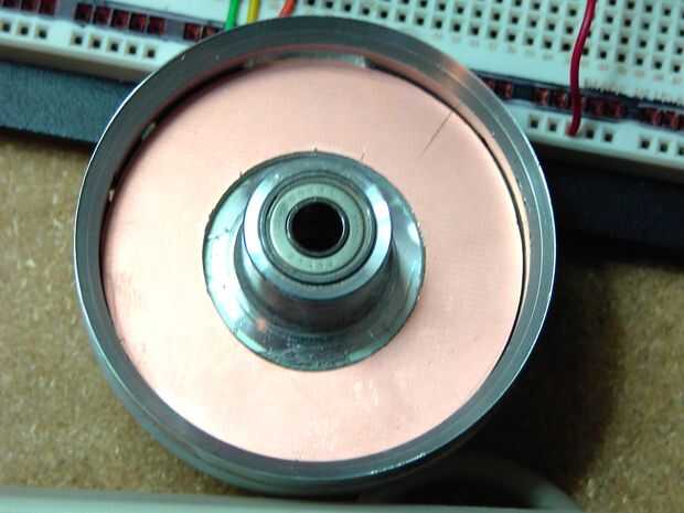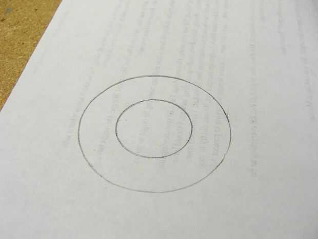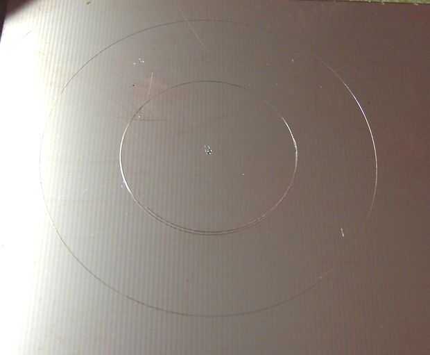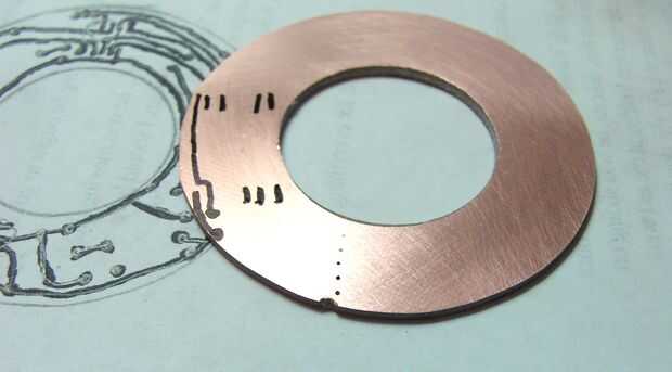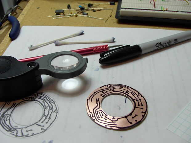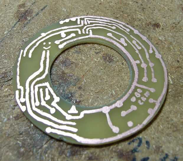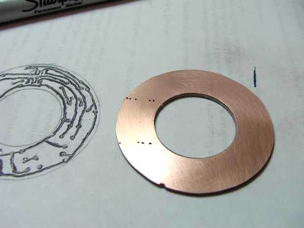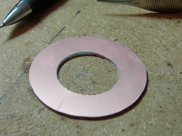 A continuación, había perforado un agujero en el punto central, a través de la PCB y en un pedazo de madera, no hendida la broca y había utilizado como un árbol. Sujetando el borde del pcb en la lijadora de disco de ángulo recto lentamente giré el pcb conseguir una forma redonda bastante decente. Para el interior he utilizado un taladro de mano y un agujero de sierras que era sólo un poco más grande pero bien.