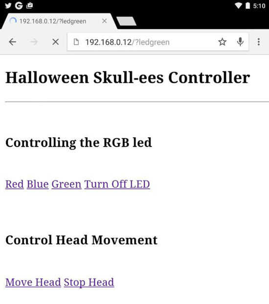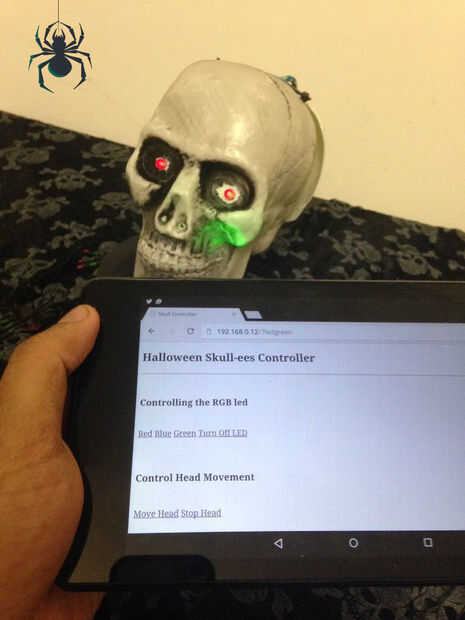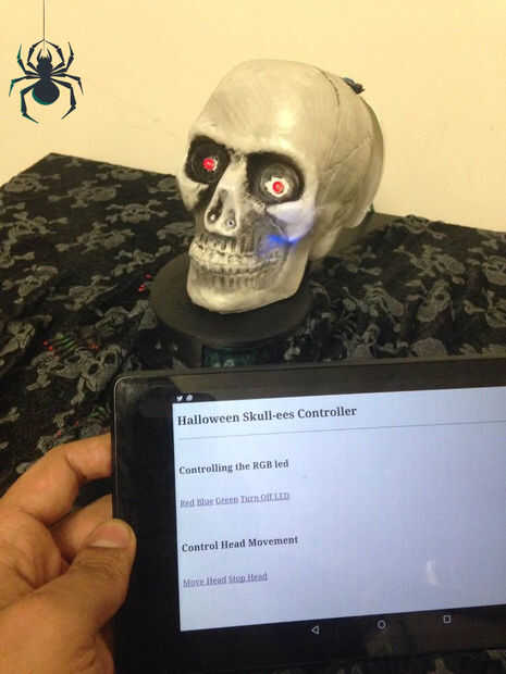 El movimiento del cráneo de giro se activa al hacer clic en el enlace de "Mover la cabeza" en la aplicación web que está alojado en Mediatek LinkIt una tabla conectada a un servo. Además puede cambiar el color de los LED RGB en el cráneo usando la aplicación web como se muestra en el video de arriba.
