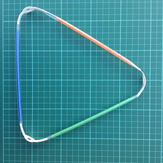 La banda del sombrero de científico loco es un triángulo. Hacerlo por unir los tres tubitos transparentes para que la pierna que está pegando de uno entra en el extremo abierto del otro.
