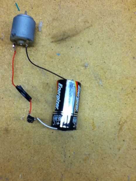 Ahora que hemos completado la peonza, tendremos que hacer la manija que gira la parte superior. La empuñadura consiste básicamente en una batería "C" que impulsa un motor y el circuito es abierto y cerrado por un botón.