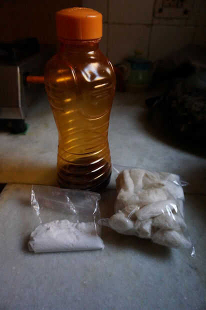 * 1 cucharadita de lejía - wormspit tiene una diversa receta para el descrudado, pero estoy usando lo que en parte - en este caso, casa hice lejía de cenizas de plantas de plátano. Lejía es fácil de hacer (un instructable aquí), pero usted también puede comprar en forma de polvo. La lejía que estoy usando es cocinar grado, tan absolutamente suave.