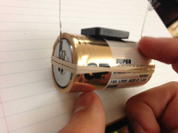 Lo que usted necesita2 Clips de papelAlambre de cobreBatería D2 bandas de cauchoCortadores de alambreImánPaso 1: sujetadores de papelTomar los 2 clips de papel y doblarlos como se ve en la foto.Paso 2: Alambre de cobre Cortar un trozo de alambre de c