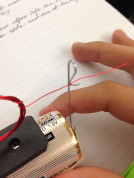 Reunir materiales:Papel de lijaBatería DBanda de goma2 clipsLongitud del brazo un cable rojo (calibre 26)ImanesPaso 1: Enrolle el cable en un círculo, dejando aproximadamente una pulgada de izquierda de alambre a cada lado.El círculo debe ser como si