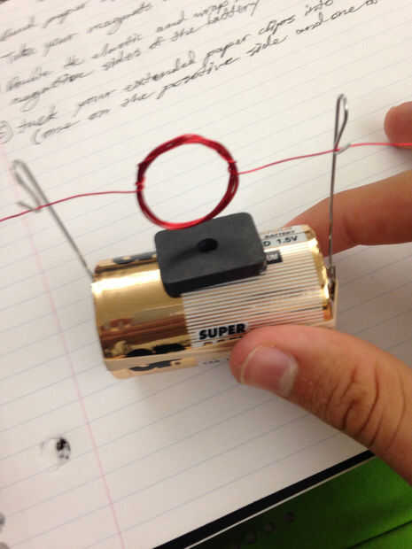 Lo que usted necesita2 Clips de papelAlambre de cobreBatería D2 bandas de cauchoCortadores de alambreImánPaso 1: sujetadores de papelTomar los 2 clips de papel y doblarlos como se ve en la foto.Paso 2: Alambre de cobre Cortar un trozo de alambre de c