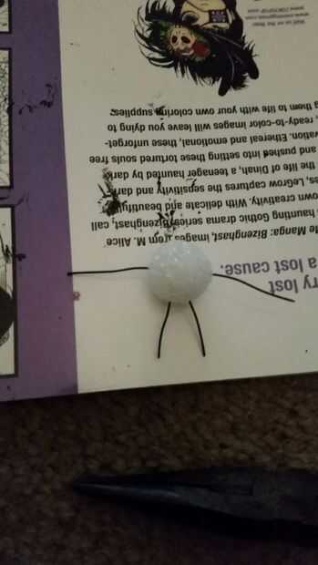Para las piernas, cortar dos trozos pequeños de alambre y puñalada en la parte inferior de la bola de espuma de poliestireno. (Estos chicos son diversión a hacer porque no son realmente tan uniformes. Los kookier parecen, mejor.)